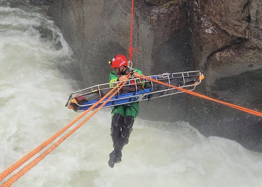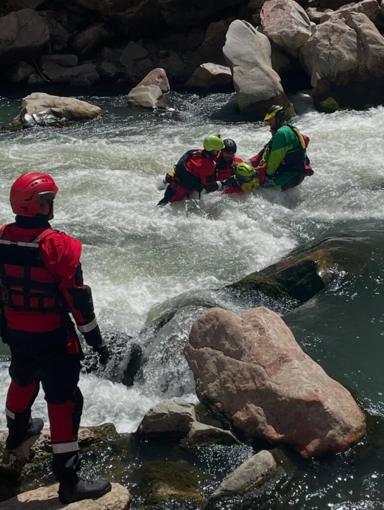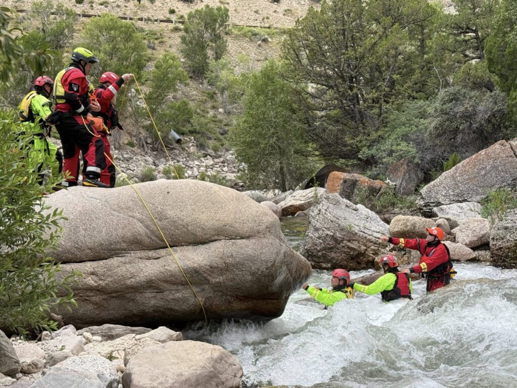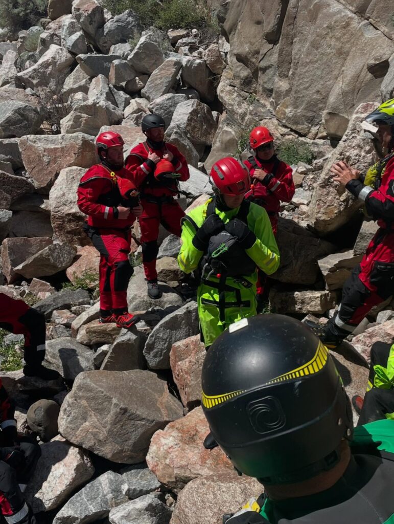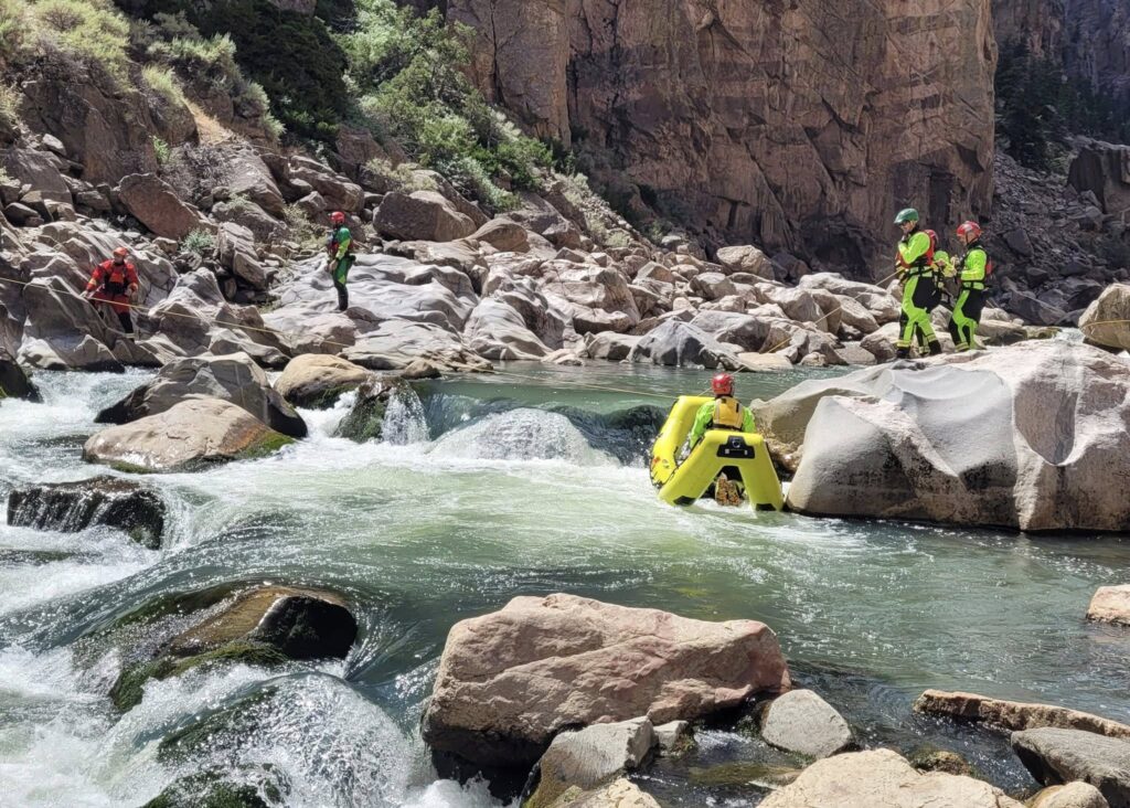 which was conducted in the Shoshone River Canyon below the Buffalo Bill Dam. The training includes extensive teamwork, coordination, and communication required between members to safely remove an injured person from the rapids.