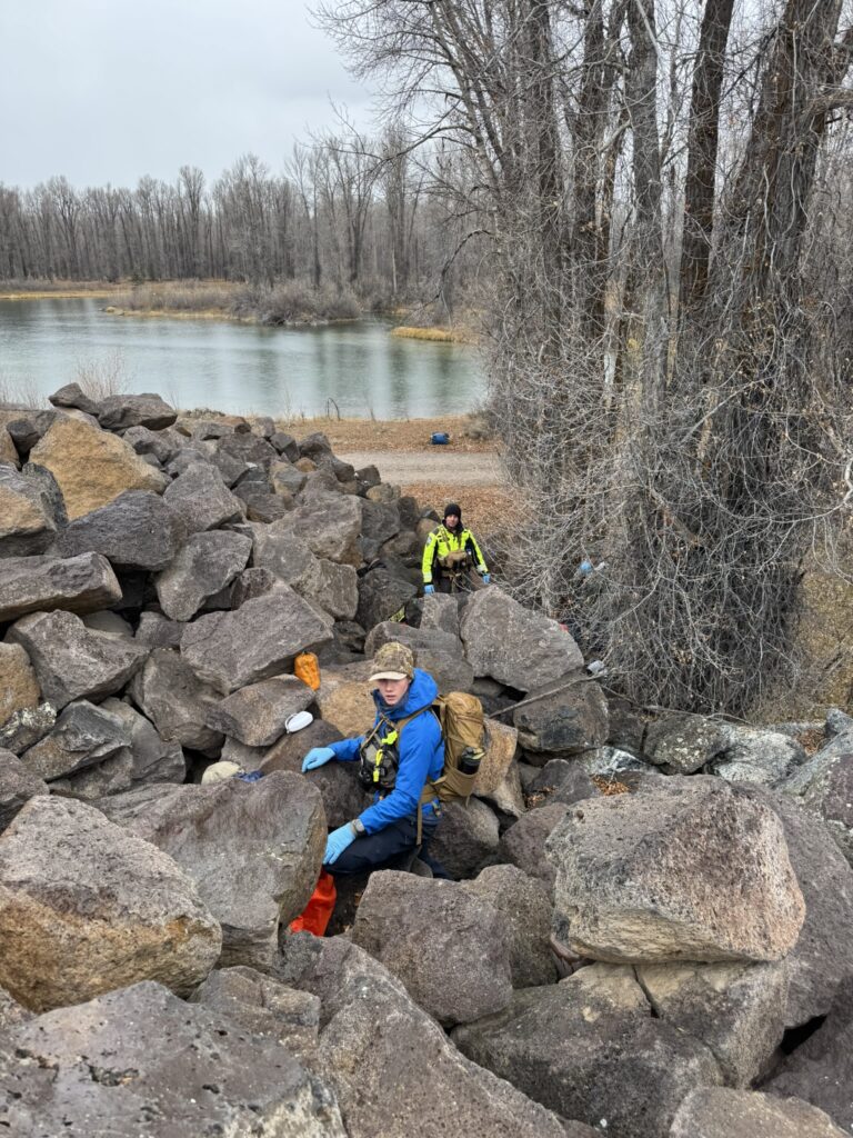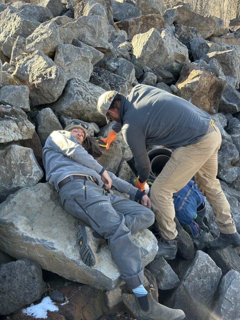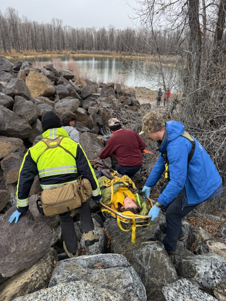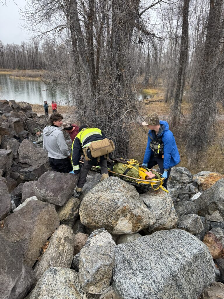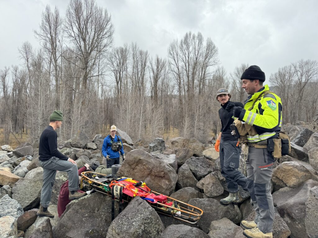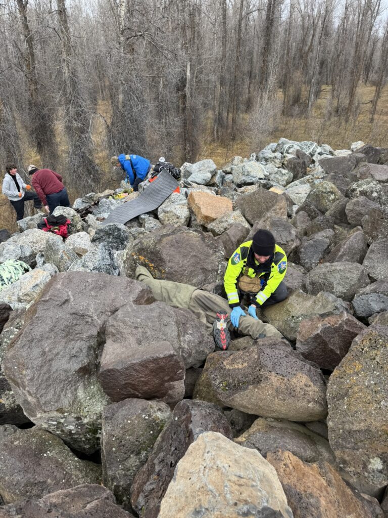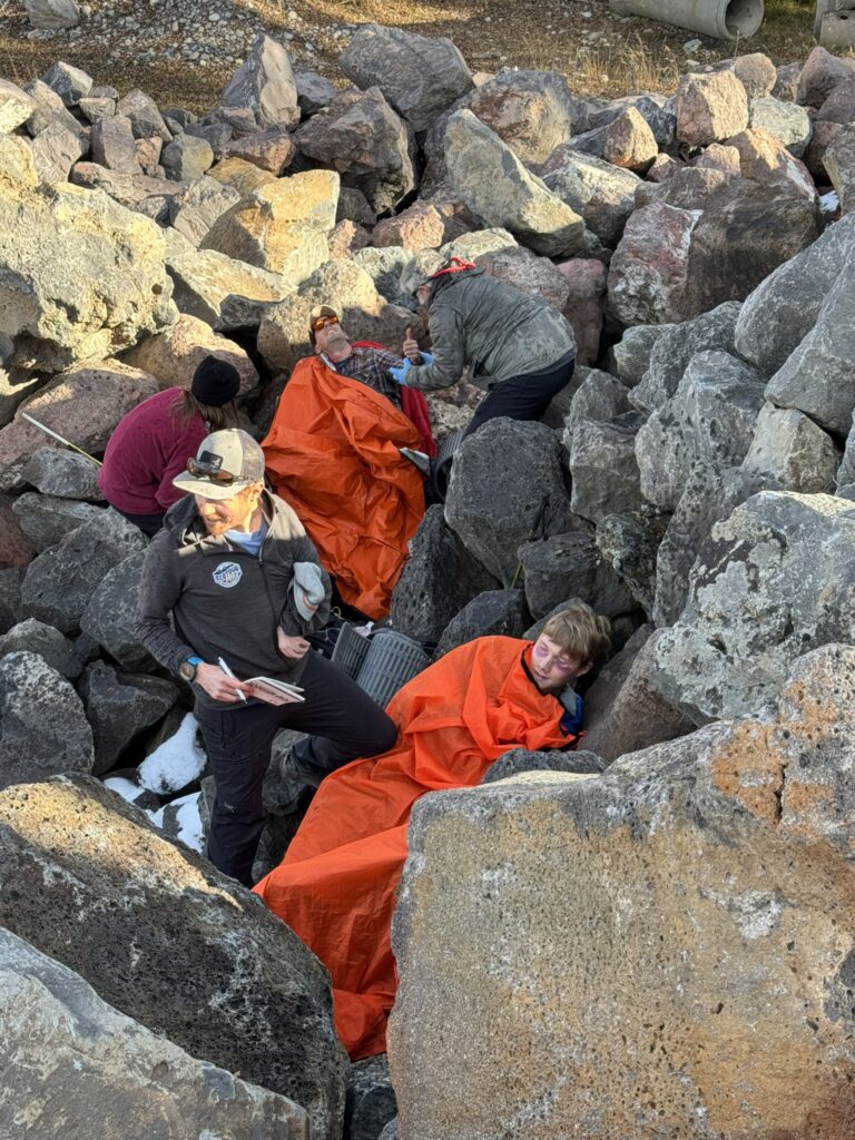 Four PCSAR members attended the Wilderness First Responder (WFR) course instructed by Wounded Bear Medicine in Jackson Hole, Wyoming. The WFR course is tailored for professionals and serious outdoor recreationalists working and traveling in outdoor, low-resource, remote, or wilderness environments. The course provides essential training in wilderness medicine, leadership, risk management, and critical thinking (woundedbearmed.com). Nick Suizzo, Anthony Aguirre, Michael Guy, and McCoy Banks all participated in this hands-on training in different extreme field environments. Photos below depict search and rescue of multiple victims in a large boulder field during damp conditions. The instructors devised ways to simulate adverse weather conditions in order to make the training more realistic.